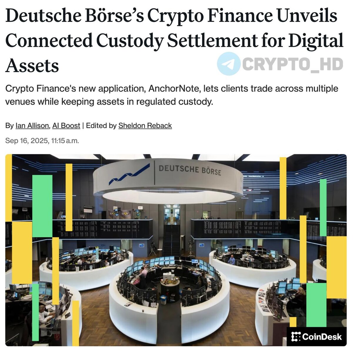 🏦 Deutsche Börse упрощает институциональную торговлю криптой. Дочерняя компания Deutsche Börse, Crypto Finance, запустила систему AnchorNote, которая позволяет институционалам торговать криптой на разных площадках, не выводя активы из регулируемого кастодиального хранения. Система AnchorNote подключена к сети BridgePort, объединяющей биржи и кастодианов. Это значит: ⊹ Расчеты происходят вне бирж. ⊹ Ликвидность доступна сразу на нескольких платформах. ⊹ Капитал работает эффективнее, а риски контрагентов снижаются. Институты смогут управлять залогом через дашборд или напрямую интегрировать сервис в свою инфраструктуру через API. Deutsche Börse – одна из крупнейших биржевых групп Европы, управляющая Франкфуртской фондовой биржей и международной клирингово-кастодиальной сетью Clearstream. Crypto Headlines