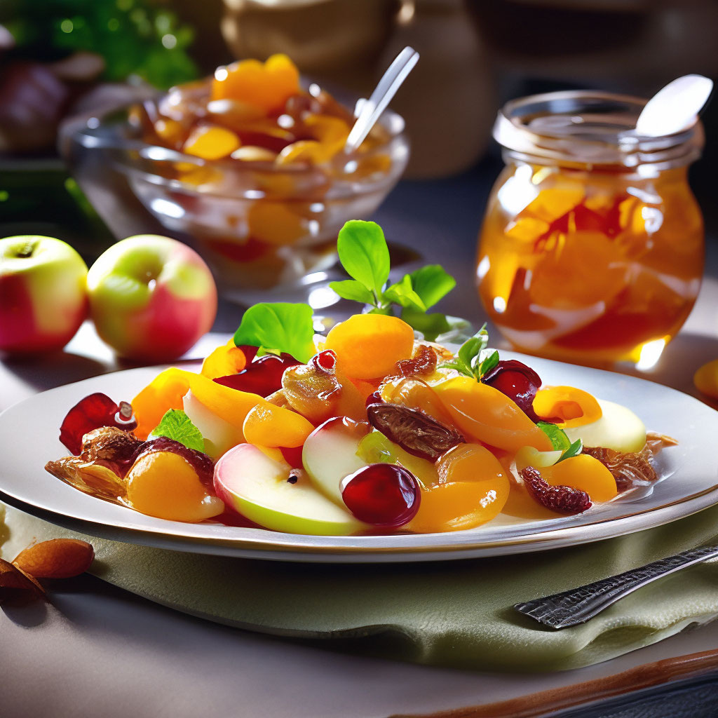 Перед подачей украсьте блюдо небольшими ломтиками кураги и декоративными листьями свежей мяты. Салат готов!