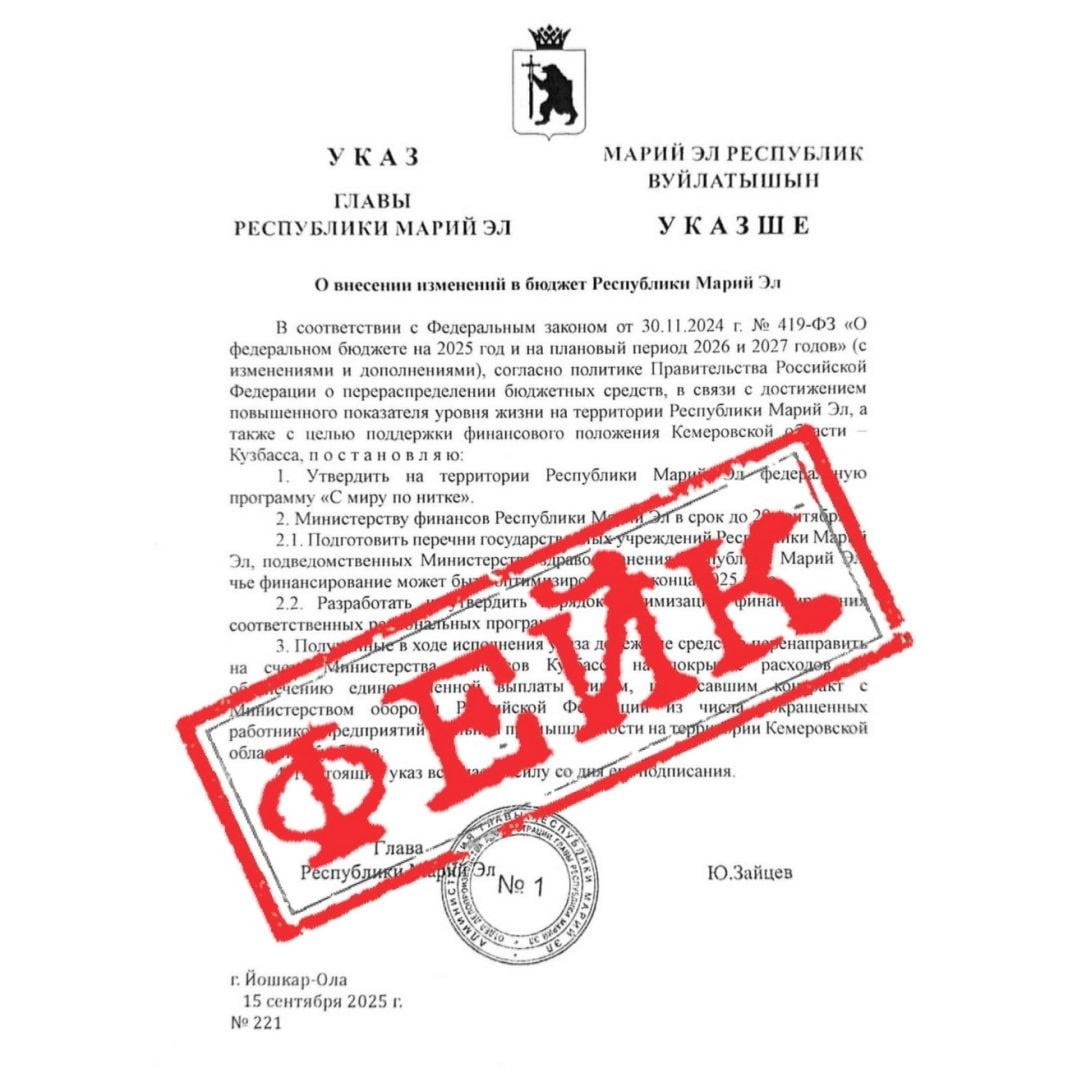 Кузбасс находится в таком состоянии, что ему вынуждены помогать другие регионы. Правда пока это всё фейк. В социальных сетях появился фальшивый указ Главы Марий Эл о финансовой помощи Кузбассу. Новый липовый указ объявляет о федеральной программе «С миру по нитке», которая начала действовать в республике, и приказывает региональному минфину проанализировать деятельность государственных учреждений, найти те, чью работу можно оптимизировать, чтобы высвободившиеся средства пошли на помощь другому региону. Эта информация – ложь, сообщили в местном минфине. ✍✍✍ТУТ✍🗞🗞ЗДЕСЬ🗞 ⚡️BOOST КАНАЛА⚡️