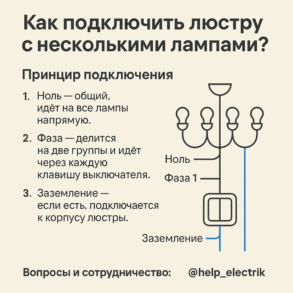 Для этого используется двухклавишный выключатель. --- Что понадобится Люстра с несколькими проводами. Двухклавишный выключатель. Клеммники или WAGO. Индикаторная отвёртка. --- Принцип подключения 1. Ноль — общий, идёт на все лампы напрямую. 2. Фаза — делится на две группы и идёт через каждую клавишу выключателя. 3. Заземление — если есть, подключается к корпусу люстры. --- Пошаговая схема 1. Отключите питание на щитке. 2. Соедините все нулевые провода люстры в один общий и подключите к нулю из потолка. 3. Каждую фазную группу соедините с отдельным проводом, идущим от выключателя. 4. Заземляющий провод соедините с соответствующим контактом. 5. Включите питание и проверьте работу поочерёдно каждой клавиши. --- Советы Используйте клеммники — это надёжнее, чем скрутки. Если проводов в потолке меньше, чем нужно, пригласите электрика. Для мощных люстр ставьте отдельную линию с автоматом. --- ✅ Вывод: подключить люстру с несколькими группами ламп пр