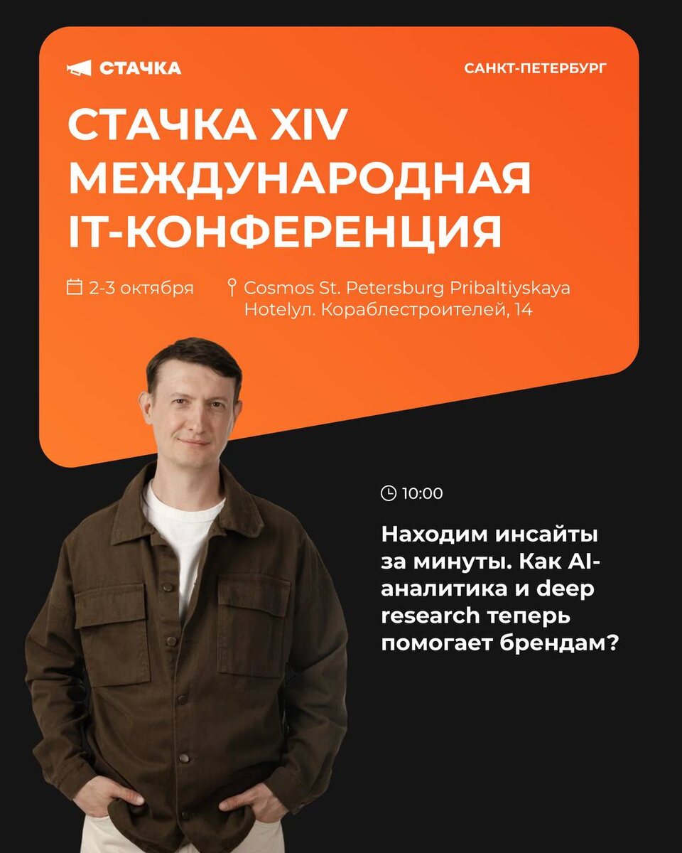 Врываюсь в октябрь с докладом на Стачке 🚀 3 октября выступаю на XIV Международной IT-конференции в Санкт-Петербурге Тема доклада: «Находим инсайты за минуты. Как AI-аналитика и deep research теперь помогает брендам?» 🕙 Начало в 10:00 О чём расскажу: ✔Почему классические методы анализа ЦА и конкурентов — медленно, дорого и поверхностно ✔Prompt-инженерия: как вытаскивать глубинные инсайты из открытых данных ✔Автоматизация через API и n8n для конкурентного анализа ✔От инсайтов к гипотезам распределения бюджета на сплит каналов ✔Это будет полезно тем, кто принимает маркетинговые решения и отвечает за рост бренда. Если вы устали от бесконечных отчетов, согласований и «серых» данных — покажу, как всё это можно ускорить и упростить без потери качества Команда «Стачки» подготовила мощную двухдневную программу 2–3 октября: десятки потоков, сотни спикеров и весь digital-рынок в одном месте. А для вас у меня есть бонус ✔ По промокоду Спикер10 получите скидку 10% на билет Буду рад встрети