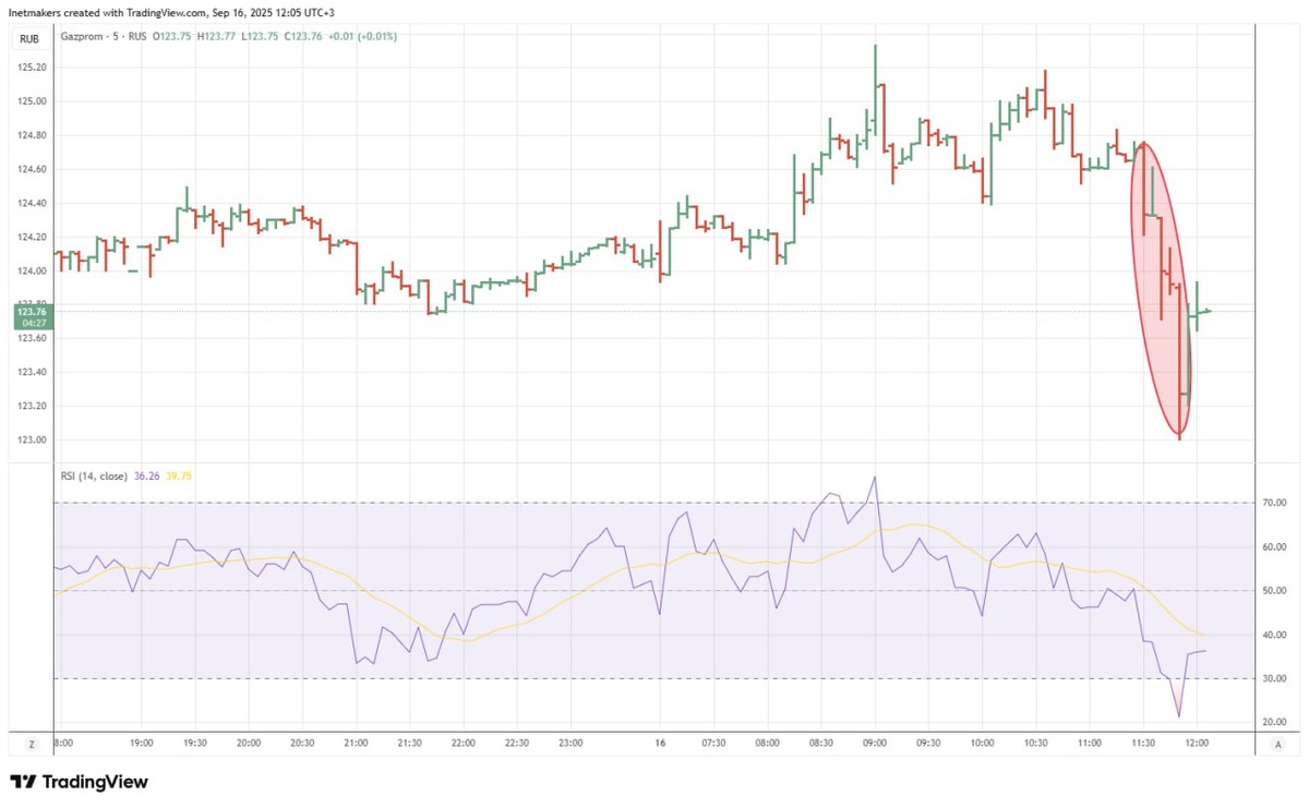 Они рынку как под дых бьют, не было же объема с утра, потом откуда-то ровно в 11:30 миллиард выкидывают. Вот смотрите график Газпрома 5-минутный.