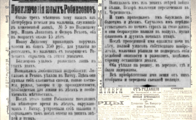 Ивану Липатову приказчик поручил внести в банк 350 руб для уплаты по векселям, и мальчик с товарищем Реховым скрылись с этими деньгами.
