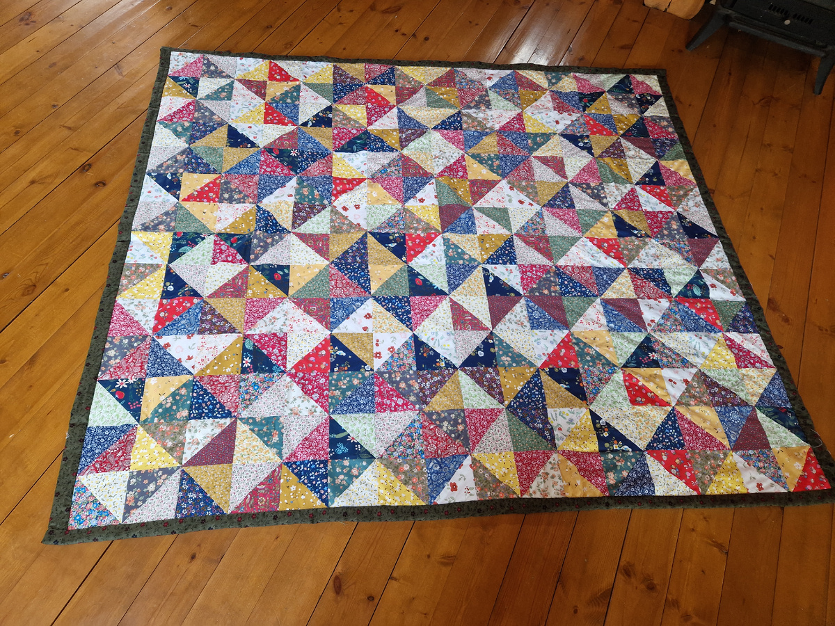 Закончила пестрое лоскутное одеяло. В планах было к началу лета, но, не сложилось. Сложилось вот только сейчас.