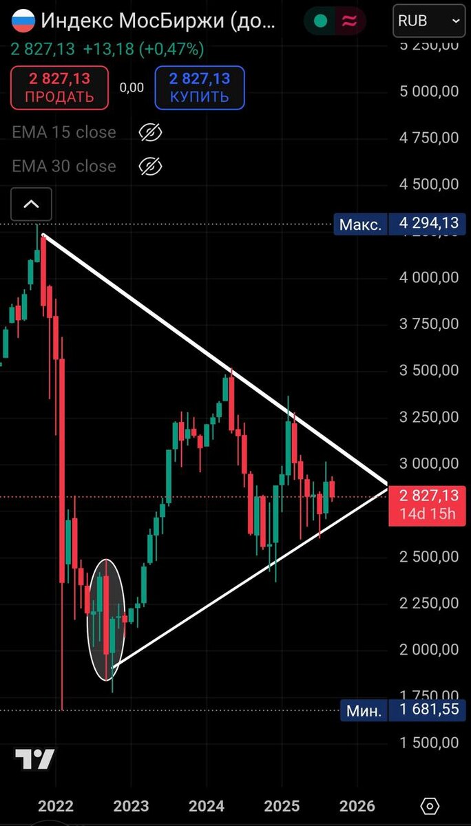☄️Треугольник ломается: ММВБ к 2700 или обвал до 1970? Продолжаем торговать в треугольнике. Недельный и дневной таймфреймы пробили вниз. На дневном графике вырисовывается идеальный параллельный канал вниз с пятью волнами. 🔽Вчера пробили и закрепились в диапазоне 2700-2850. Теперь ничего не мешает сходить к отметке 2700 — там находится нижняя граница глобального треугольника по месячному таймфрейму. Лодка раскачивается. Цена по индексу ММВБ ходит от верхней границы треугольника к нижней. Каждая новая вершина ниже предыдущей. А что, если пробьем треугольник вниз? Если это произойдет, значит, у кого-то есть негативная информация по геополитике. Как сказал Олейник, война с НАТО неизбежна — и тогда полетим на 1970. 🔹Итог прост: несмотря на напряжённость и возможный прорыв вниз, именно в таких ситуациях появляются лучшие возможности для входа по выгодным ценам. Оставайтесь на чеку, держите план и помните — кто готов к риску сегодня, завтра пожнёт плоды.