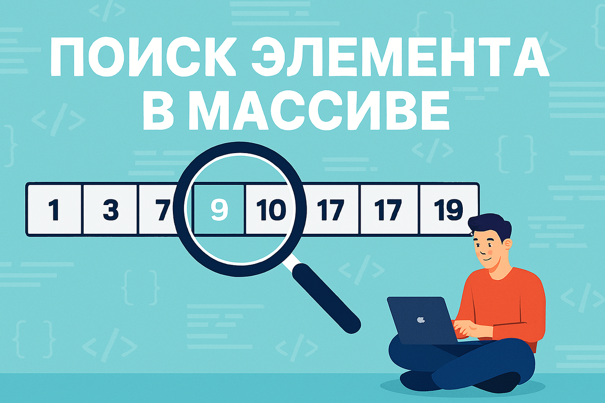 Данная статья посвящена разбору одной из простых тем, связанную с поиском элемента в массиве. Мы разберем, как найти элемент в массиве, какие существуют алгоритмы, а также обсудим их асимптотические сложности. Для написания кода будем использовать Python. Итак, представим простую задачу: у нас есть массив, состоящий из 10 чисел: [1, 6, 3, 9, 0, 23, 5, 55, -23, 7]. Необходимо найти индекс элемента со значением -23. Первое наивное решение, которое приходит в голову, пройтись по всем элементам массива, сравнивая их с искомым числом. Если текущий элемент не равен числу, двигаемся дальше, иначе мы нашли искомое число и возвращаем его индекс. Простой алгоритм на Python выглядит так: Для лучшего понимания посмотрим принцип работы алгоритма на видео: Рабочее решение! Но есть нюансы. Проблема данного алгоритма заключается в том, что скорость поиска элемента в массиве линейно зависит от количества элементов в нем. Проще говоря, если количество элементов будет, например, 10^5, то алгоритм уже не