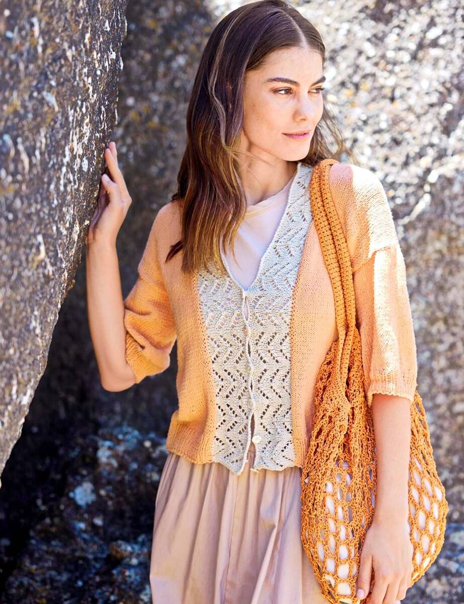 Стильный комплект, который подойдёт не только для жаркого лето, но и для золотой осени! Двухцветный кардиган в оранжево-белых тонах и незаменимая сумка-шопер крупным сетчатым узором из популярного журнала по вязанию «Сабрина» за июнь 2025 г.