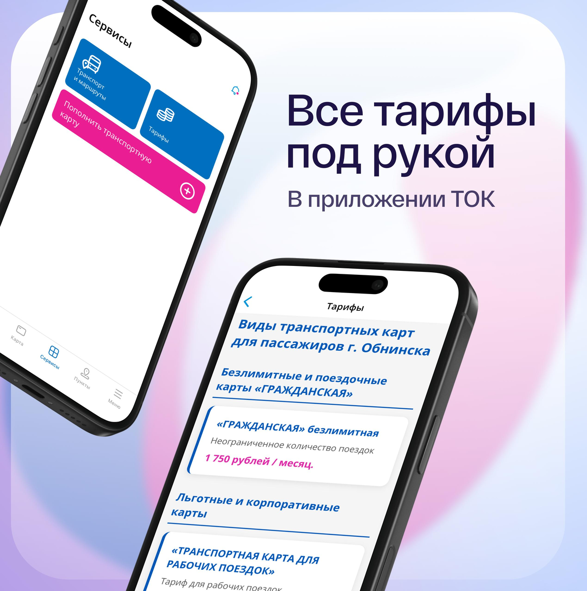 В нижней части экрана выберите раздел «Сервисы» и перейдите к «Тарифам». Там вы найдете полный перечень тарифов транспортных карт Калужской области. В этом разделе можно сразу ознакомиться с их стоимостью и условиями, так как все тарифы всегда под рукой. 💡 Также в ТОКе вы можете пополнить большинство транспортных карт с моментальной записью операции. Обнинские школьники и их родители тоже экономят на оплате проезда!