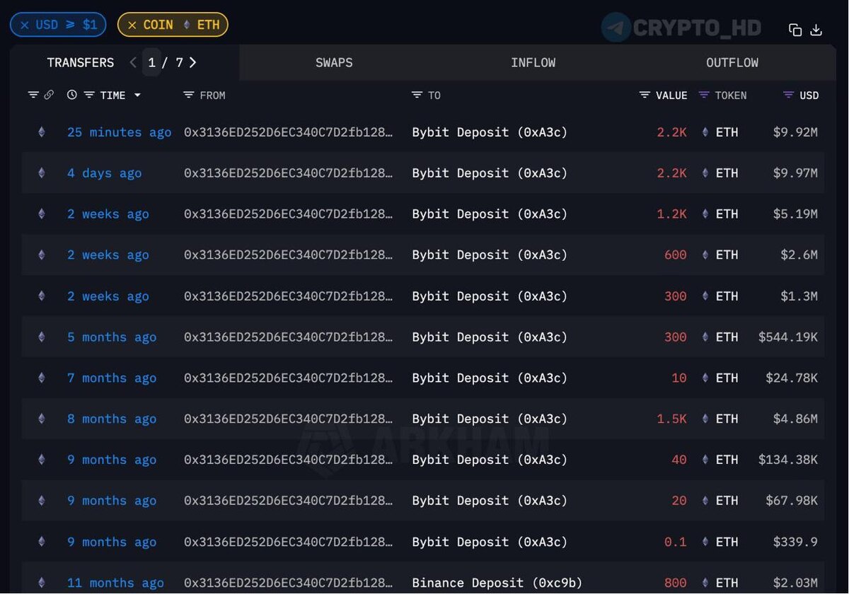 π #ETH Ethereum-ΠΊΠΈΡ ΠΈΠ· 2017 Π³ΠΎΠ΄Π° ΠΏΡΠΎΠ΄ΠΎΠ»ΠΆΠ°Π΅Ρ ΡΠΈΠΊΡΠΈΡΠΎΠ²Π°ΡΡ ΠΏΡΠΈΠ±ΡΠ»Ρ β ΠΏΠ΅ΡΠ΅Π²Π΅Π» 2200 ETH ($9,92m) Π½Π° Bybit