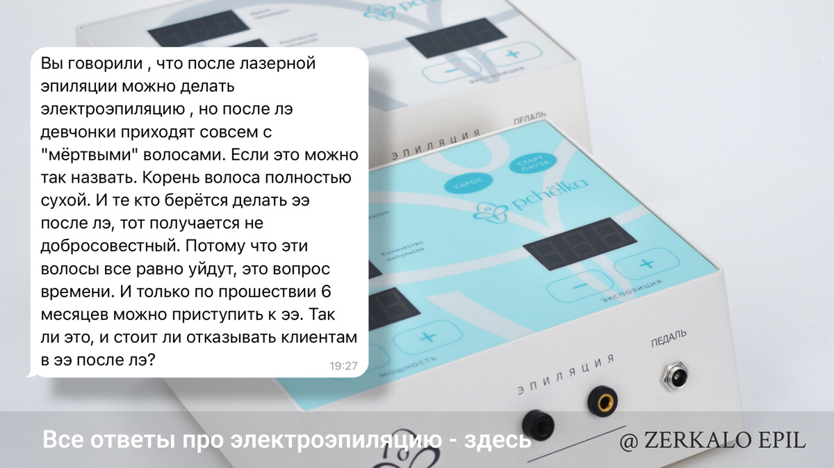 ❓Вопрос: Вы говорили , что после лазерной эпиляции можно делать электроэпиляцию , но после лэ девчонки приходят совсем с "мёртвыми" волосами. Если это можно так назвать. Корень волоса полностью сухой. И те кто берётся делать ээ после лэ, тот получается не добросовестный. Потому что эти волосы все равно уйдут, это вопрос времени. И только по прошествии 6 месяцев можно приступить к ээ. Так ли это, и стоит ли отказывать клиентам в ээ после лэ? Похожий вопрос: Ходила на ЭЭ после лазера и тоже мастер сказала что куча не в активной стадии. Дальше делать или ждать ещё? После лазера прошло 3 месяца Рубрика “ответы на вопросы” 💬 Ответ: Волосы после лазера могут видоизменяются, но на эффективность электроэпиляции это не влияет. Что значит с «мертвыми волосами»?)) волос растет - значит он не «мертвый». Как при этом выглядит его корень - это не важно. Есть волос, есть зона роста волоса - её надо разрушить. Вид корня волоса не важен ни в каком случае. Ни какой он от природы, ни какой он после каки