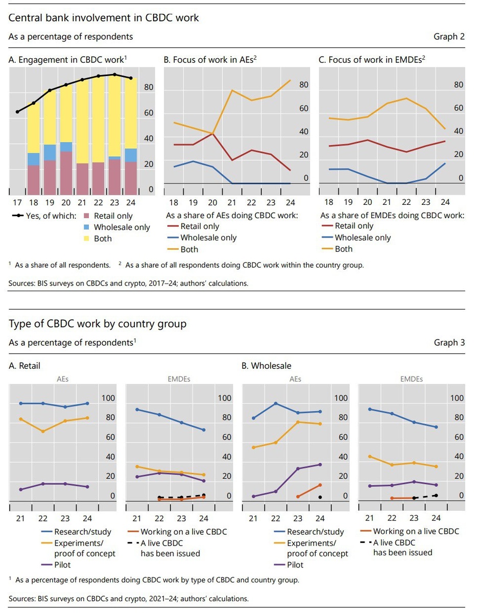 Большая часть мировых ЦБ работает над своими цифровыми валютами Порядка 90% мировых центральных банков в той или иной степени работают над своими собственными цифровыми валютами - таковы результаты исследования Банка международных расчётов (графики оттуда же, простите, честно стащил их). У нас иногда можно услышать рассуждения, что, де, наш ЦБ со своими разработками цифрового рубля впереди планеты всей (в "технологиях" или в создании "цифрового концлагеря" - зависит уже от комментатора), но на самом деле это вполне себе общемировой тренд. Другой вопрос, что очень немногие страны на текущий момент дошли до реализации: работающие цифровые валюты есть только у центральных банков Багамских островов, Ямайки и Нигерии - такой себе наборчик. У развитых же стран (AEs на графике) по большей части даже пилотных проектов нету, не говоря уж о том, что ни одна из них не работает над "боевой" версией своей цифровой валюты! Развивающиеся страны (EMDEs) здесь гораздо активнее.