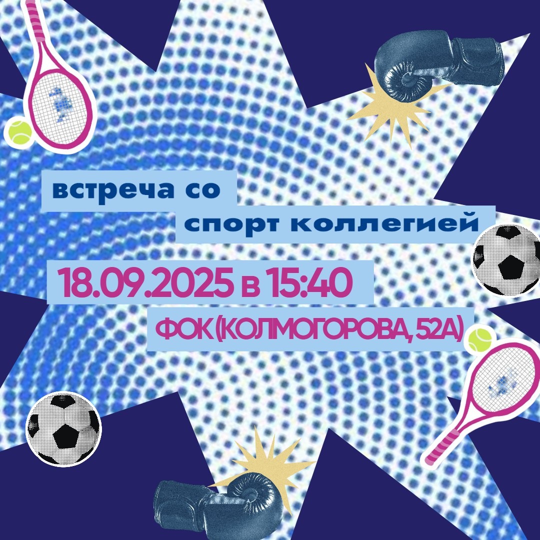 Приглашаем всех студентов, занимающихся спортом на профессиональном или любительском уровне, проявить себя в спортивной жизни Университета. Спортколлегия Студенческого совета объявляет отбор кандидатов для: ⚽️занятий в спортивных секциях 🥇представления Института и ВУЗа на соревнованиях различного уровня 🤩Встреча состоится: 📆18 сентября 2025 года в 15:40 ⛳️Физкультурно-оздоровительный комплекс (ул. Колмогорова, 52А) В программе: ⚡️Собеседование с куратором по спортивной работе ⚡️Определение спортивной специализации и уровня подготовки Готовься к новым спортивным достижениям вместе с нами!