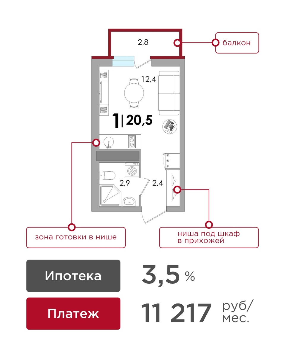 Например, уютную студию 20,5 м2 можно приобрести всего за 14 815 руб/мес. Это идеальный вариант для сдачи в аренду — есть ниши для