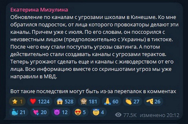 Екатерина Мизулина: Информацию о каналах с угрозами направили в правоохранительные органы. Глава «Лиги безопасного интернета» рассказала подробности об угрозах атак на кинешемские школы. Подробности 👉🏻 здесь.