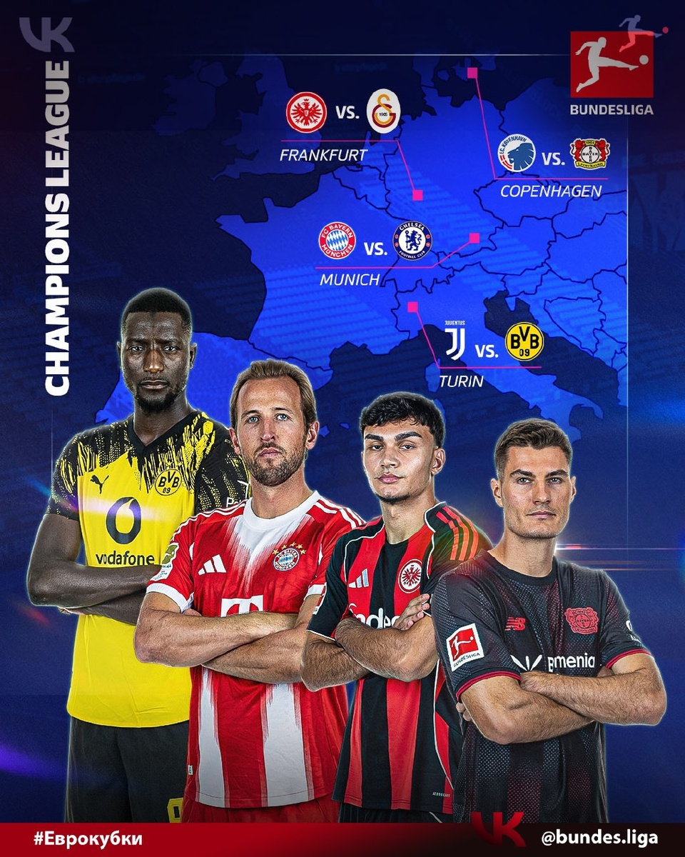 #ЛигаЧемпионов стартует! ⚽🏆 Матчи немецких команд 🇩🇪🔥 16 сентября (вторник): ⌚22:00 (мск) «Ювентус» — «Боруссия» Дортмунд 17 сентября (среда): ⌚22:00 (мск) «Бавария» — «Челси» 18 сентября (четверг): ⌚ 19:45 (мск) «Копенгаген» — «Байер» ⌚ 22:00 (мск) «Айнтрахт» — «Галатасарай»