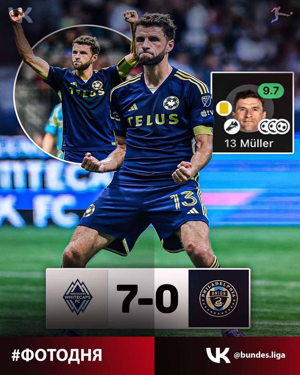 #ФотоДня 📸 Томас Мюллер сделал хет-трик за «Ванкувер» в день своего 36-летия 🎁 У него 4 гола в 3 матчах 👑 Томас забил три гола в одном матче впервые с 2018 года.