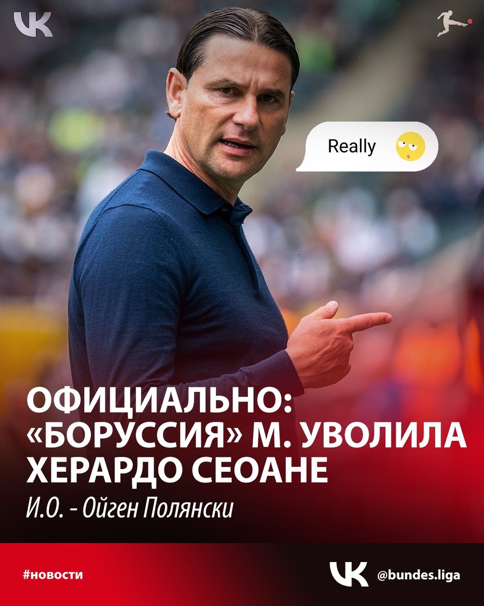 🚫 Официально: «Боруссия» Менхенгладбах уволила Херардо Сеоане 👋 Неудачное начало сезона привело к решению «Боруссии» Менхенгладбах расстаться с главным тренером Херардо Сеоане. Клуб не смог победить в первых трех матчах Бундеслиги 2025/26, что вынудило руководство клуба принять кардинальные меры. Отметим, что клуб не смог забить ни одного гола в первых трёх турах. ✅ Исполняющим обязанности главного тренера назначен Ойген Полянски.