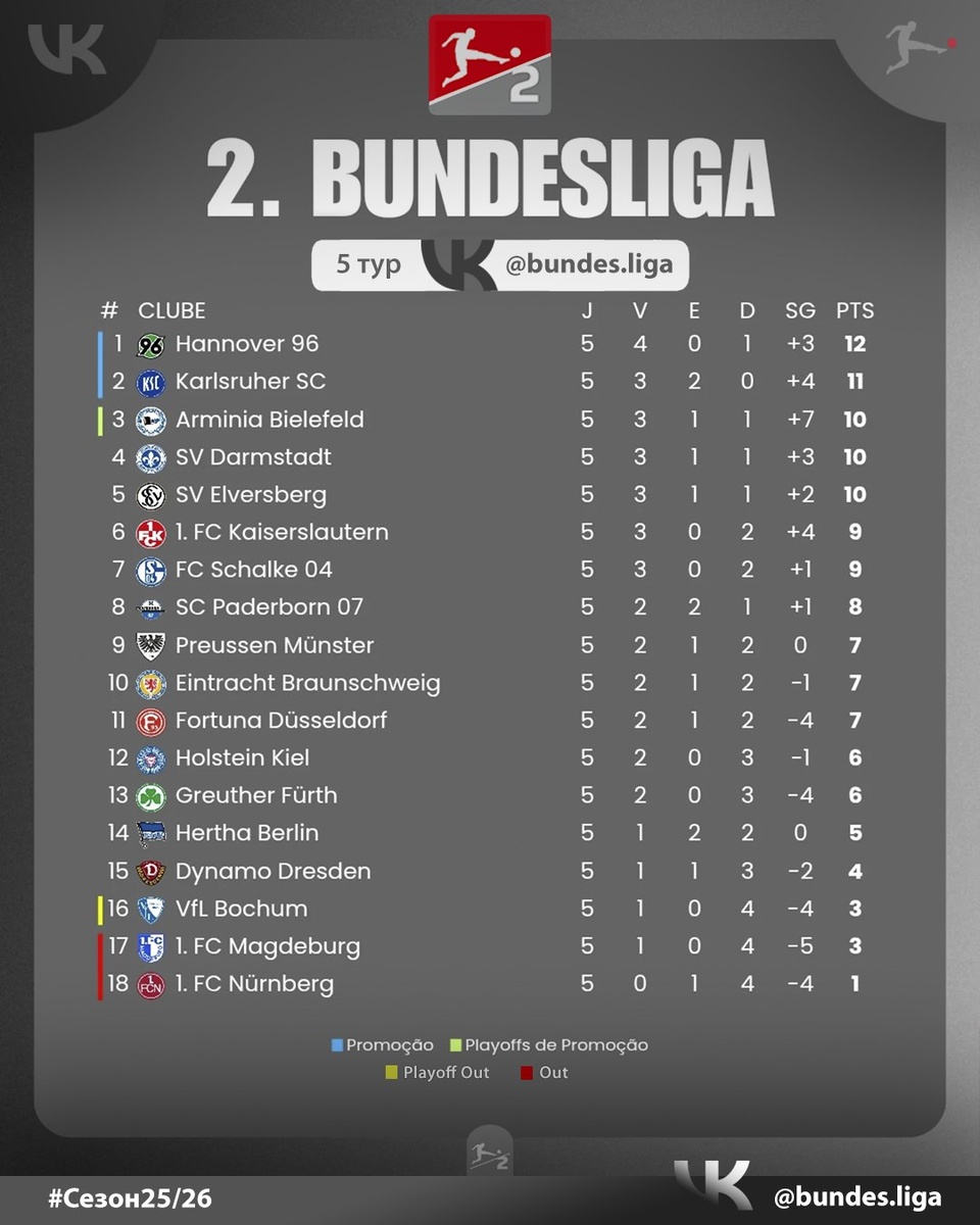 #2Бундеслига 🇩🇪 Результаты матчей 5-го тура Второй Бундеслиги! "Ганновер 96" терпит первой поражение. "Герта" стала первой командой кто не только победил лидера во второй Бундеслиге лидера, но и сделала это разгромно. Причём "Ганновер 96" проиграл 0:3 при своих трибунах 🙁 "Карлсруэ" - единственный клуб, не знающий поражений в новом сезоне. А "Нюрнберг" вместе с Клозе - пока не понимает как выиграть 🤦♂ Мирослав близок к увольнению как никогда... Пройссен Мюнстер 1:2 Фортуна Эльверсберг 2:2 Динамо Дрезден Гройтер Фюрт 0:3 Кайзерслаутерн Дармштадт 2:1 Айнтрахт Бр Шальке-04 0:1 Хольштайн Киль Карлсруэ 2:1 Нюрнберг Ганновер 96 0:3 Герта Арминия 2:0 Магдебург Падерборн 1:0 Бохум