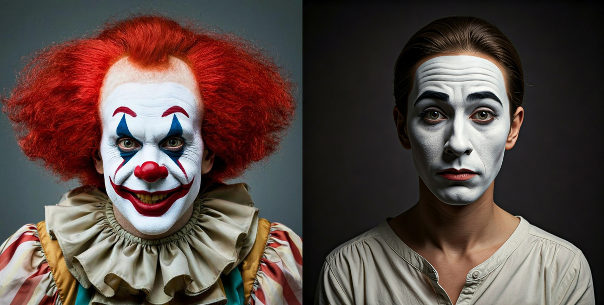 Представьте себе двух артистов. Оба надевают грим, оба говорят без слов, оба стремятся рассмешить. Но почему-то один вызывает улыбку, а у другого волосы на руках встают дыбом. Ребенок может завороженно смотреть на мима на набережной, но зайти в палатку с клоуном — для многих настоящее испытание смелости.