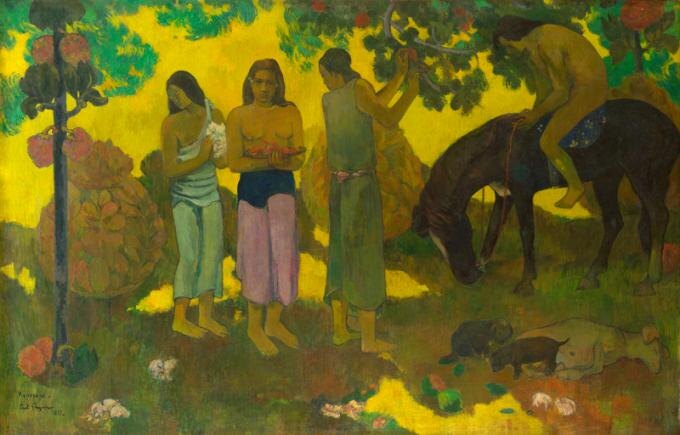 Работы Поля Гогена – это те полотна, рядом с которыми мне всегда немного неуютно. В них безумствуют цвета, но так мало бывает света и солнца, так тесно и плотно, такими тяжелыми пластами лежат эти сочные пятна чистого цвета, что зачастую хочется отвернуться и отдышаться. Да и сюжет картин… Мне всегда кажется, что эти безумные цвета – как грим, которые призван скрывать какой-то ужас, какой-то грех, какую-то очень неприглядную правду. Вот так и полотно «Сбор плодов», которое Гоген создал в последние годы жизни, имеет очень сильный эффект: чем дольше на него смотришь – тем меньше веришь, что это обычная бытовая сцена. «Сбор плодов» - крошечный миг беззаботной таитянской жизни. Природа изобильна и щедра – можно просто протянуть руку и нарвать полную пригоршню фруктов. В целом нет даже какой-то особой необходимости их как-то запасать, потому нет корзин поблизости – просто набери столько, сколько сможешь унести, и лакомься. Потому, наверное, и не спешит никто – все фигуры статичны, расслаб