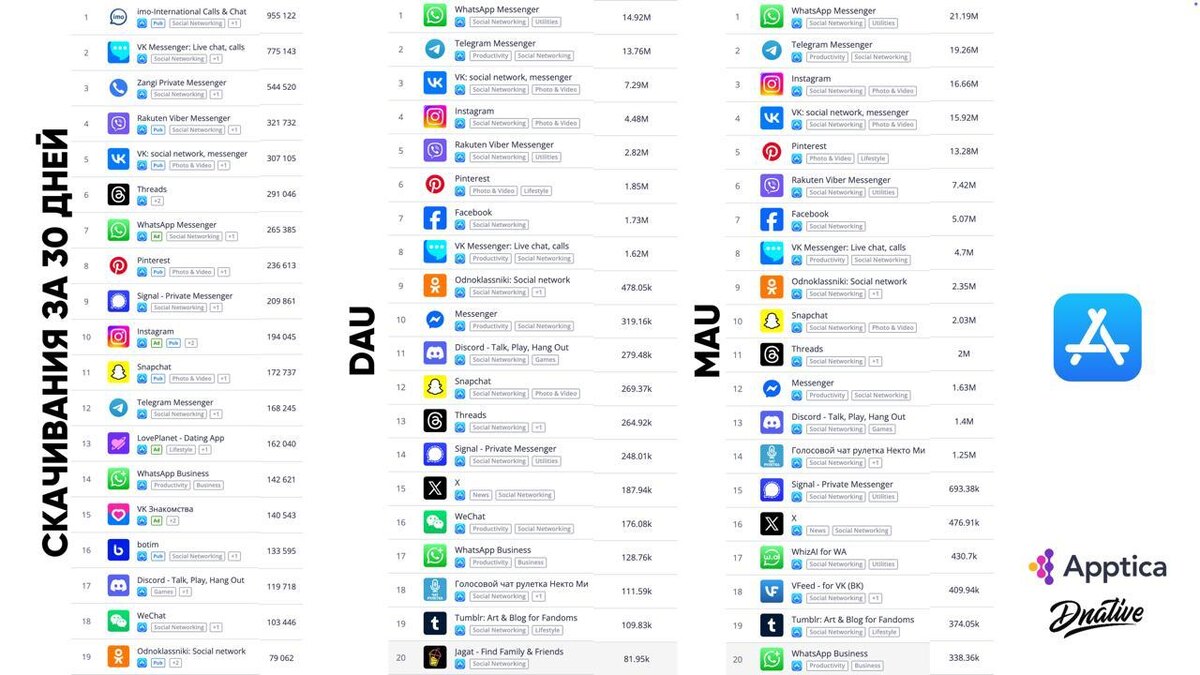 📊 Кто лидер среди соцсетей в России по аудитории? Аналитический сервис Apptica опубликовал статистику по аудитории мобильных приложений за последние 30 дней. Цифры не являются абсолютными — это оценка на основе данных партнёров, однако они дают представление о расстановке сил на рынке: • Viber остается в топе по аудитории, несмотря на то, что в публичном поле сервис заметно реже обсуждается • Pinterest демонстрирует резкий разрыв между MAU и DAU: на Android — 17,5 млн пользователей в месяц против 2,7 млн в день • WhatsApp значительно опережает конкурентов по охвату • ВКонтакте стабильно обгоняет Telegram по аудитории • Instagram* сохраняет свыше 30 млн MAU на iOS и Android вместе Статистика учитывает только мобильные версии приложений, без веб-доступа 🤳 *запрещенная соцсеть на территории РФ