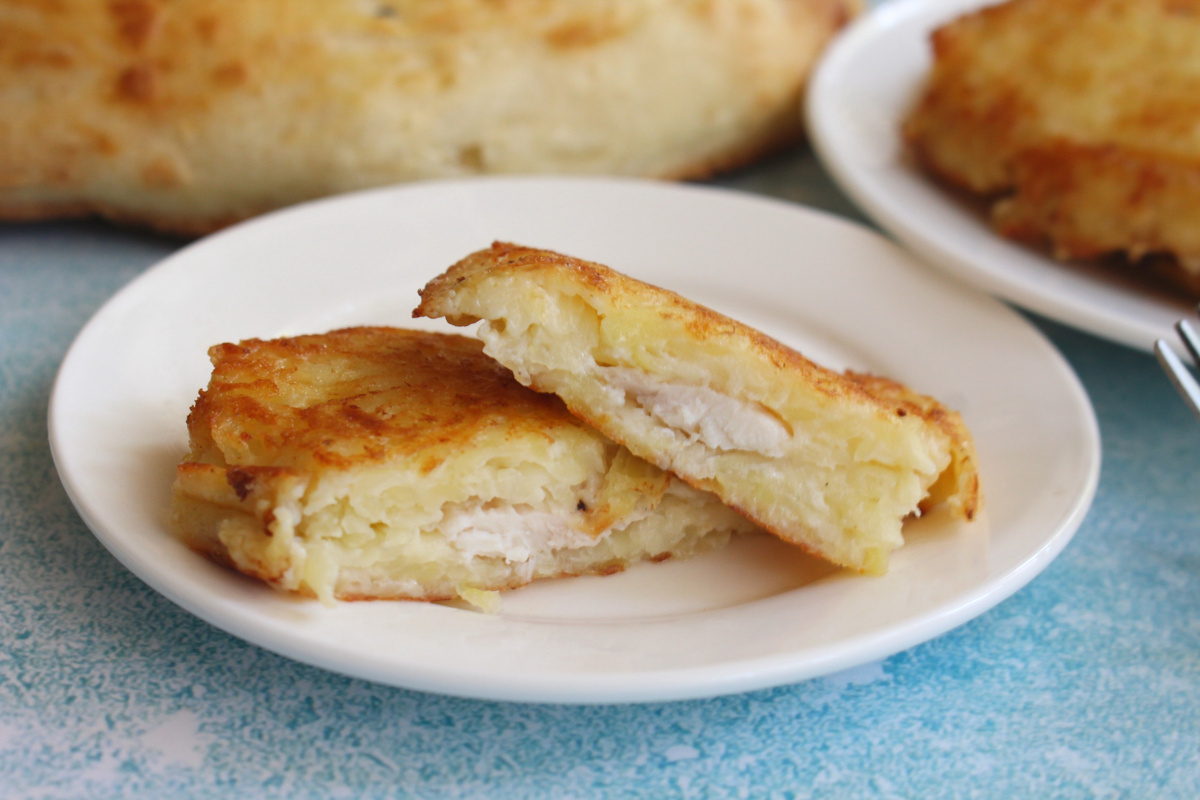Если надоели обычные драники, то будем готовить драники с начинкой. Это очень вкусные драники, любители картофельных блюд будут рады! Драники получаются мягкие, сытные, толстенькие и золотистые. Готовятся быстро, просто, а съедаются еще быстрее. Вместо куриной грудки можно взять куриное филе с любой части тушки. Если вы привыкли добавлять в тесто для драников репчатый лук, то делайте с луком. Есть два варианта приготовления таких драников. Первый вариант: обжаривать драники с двух сторон на сковороде на очень маленьком огне. Второй вариант: обжарить драники быстро с двух сторон на сковороде, а потом запечь их в духовке в течение 20 минут. Я готовлю драники без запекания. Картофель - 800 г. Куриное филе - 300 г. Яйцо куриное - 2 шт. Мука - 3 ст.л. Сметана - 2 ст.л. Перец свежемолотый смесь - 2 щепотки Соль - по вкусу Масло растительное для жарки Картошку натрем через крупную терку, вбиваем яйца и добавляем жирную сметану. Я добавляю каймак. Добавим в чашку соль, молотый перец и муку. П