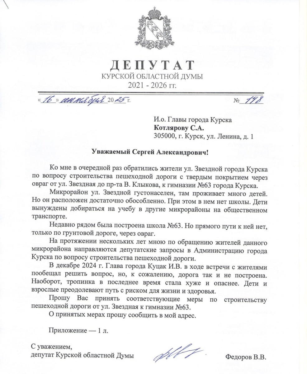 Депутат Фёдоров просит обезопасить опасную дорогу в школу в Курске