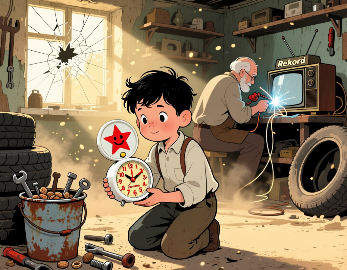 Меня зовут Костя, мне двенадцать, и я, как и все нормальные пионеры, обожаю находить странные вещи. Особенно — в гараже дедушки Петра Ивановича, где пахнет маслом, пылью и чем-то, что мама называет «советским прошлым, которое не выбрасывают, а ждут, пока оно само исчезнет». Именно там, под ржавым ведром с гайками, я и нашёл его — будильник «Звёздочка».