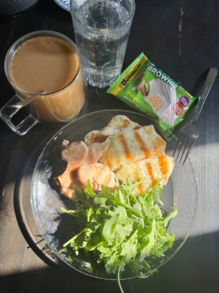 Мой идеальный кето-завтрак: Сыр Халумис на гриле 94 г Куриная грудка на гриле 106 г Руккола 30 г Протеиновое печенье (3,8 г углеводов на порцию) Вода Кофе свежесваренный «Сырный» по моему рецепту