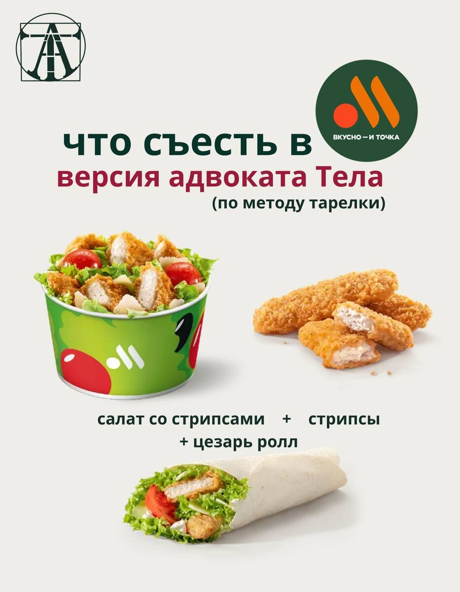 🍔Что делать, если вы придерживаетесь здорового питания, проголодались, а рядом только вкусно и точка? Терпеть нельзя поесть— где поставить запятую? 🍽️Адвокаты Тела настаивают на том, что в любом месте можно поесть функционально, если знать правило тарелки Собрали для вас примеры отличного обеда или ужина ✨