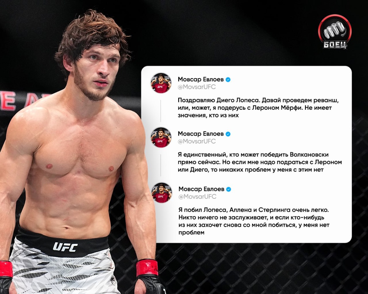 Мовсар выразил желание подраться с кем-то из пары Мерфи – Лопес. Также он поздравил Диего с победой и упомянул о своих победах над топами 👊