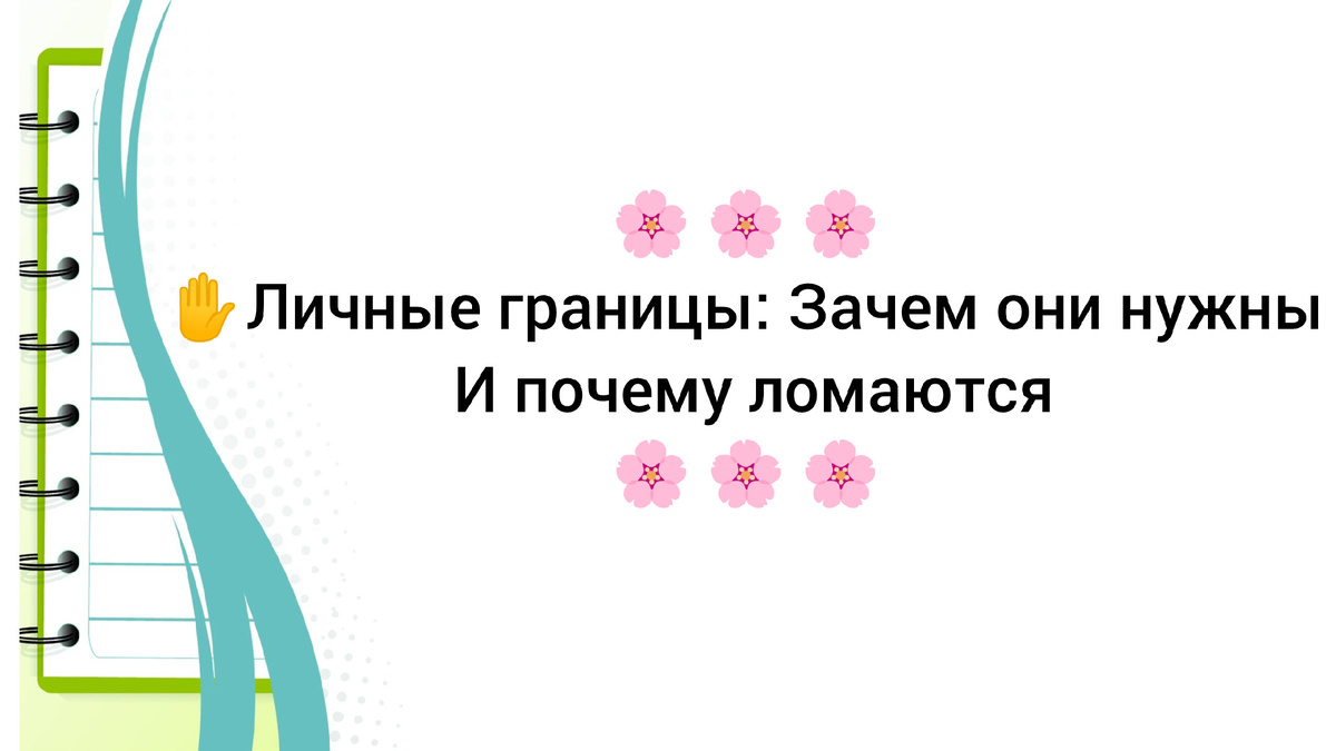 ✋Личные границы: Зачем они нужны и почему ломаются Границы - это не про «строить стены», а про то, чтобы честно понимать: где заканчиваюсь я и начинаются другие. ➕Когда у человека здоровые границы: ⏺️он умеет сказать «да» и «нет» без чувства вины, ⏺️его решения уважают, ⏺️он сохраняет энергию и не выгорает. ➖Когда границы слабые: ⏺️человек соглашается из страха обидеть, ⏺️чувствует усталость, потому что постоянно тратит силы «на других», ⏺️копится раздражение и обиды. 🖇️Ты не контролируешь то, что происходит.. Ты контролируешь то, как ты реагируешь на это. 🖇️Личные границы - это понимание, что для меня нормально, а что нет. ➖➖➖➖➖➖➖➖➖