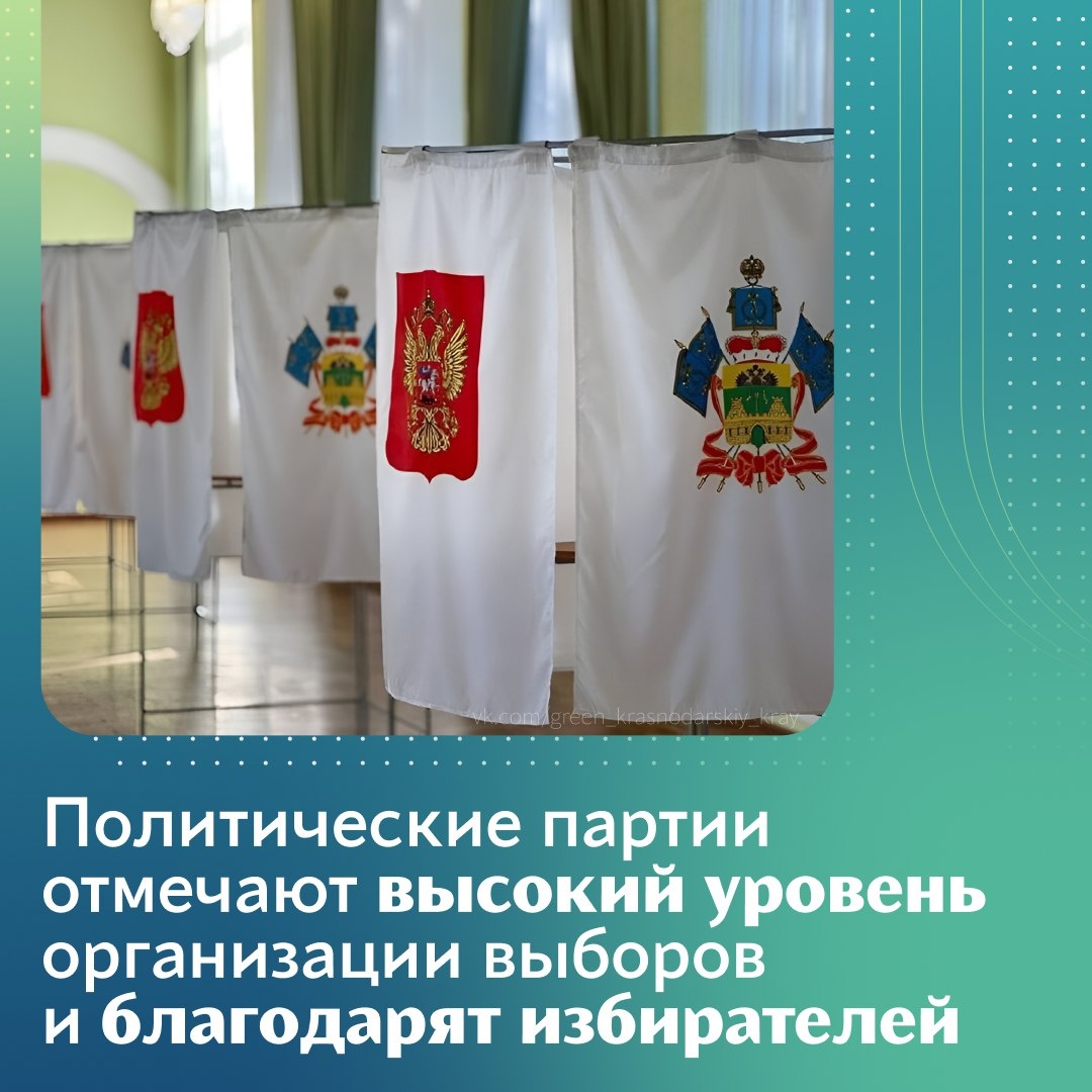 В Краснодарском крае завершились выборы! В настоящее время подводятся итоги голосования. Уже можно отметить высокий уровень организации избирательных кампаний 📈 Политические партии выражают благодарность всем, кто был причастен к подготовке, проведению и участию в выборах: Краснодарское региональное отделение политической партии «Новые люди»: https://t.me/newpeople_krasnodar/1560 Секретарь регионального отделения «Единой России» Николай Гриценко: https://t.me/erkuban/1967 Представитель регионального отделения политической партии «Справедливая Россия — Патриоты — За правду» Денис Хмелевской: https://t.me/hmelevskoydl/5303 Краснодарское региональное отделение политической партии «ЛДПР»: https://dzen.ru/media/id/645290a0c1aa6632aad370cf/krasnodarskoe-regionalnoe-otdelenie-ldpr-vyrajaet-blagodarnost-chlenam-izbiratelnoi-komissii-krasnodarskogo-kraia-68c82afde8ba3d607058ee16 Краснодарское региональное отделение Российской экологической партии «Зелёные»: https://vk.com/wall-216704076