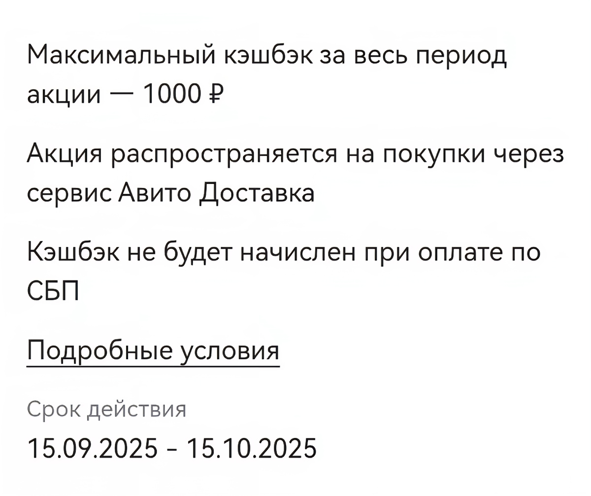 • Лимит кэшбэка 1000₽ за акцию • Акция распространяется на покупки через Авито Доставку • Оплата по СПБ не подойдёт • Кэшбэк придёт 10 числа следующего месяца Ссылка 👈 до 80% на 3 первые доставки для новых пользователей Ссылка 👈 до 60% на 1 первую или повторную доставку для всех клиентов Срок действия акции с 27.02.2025 по 30.09.2025.