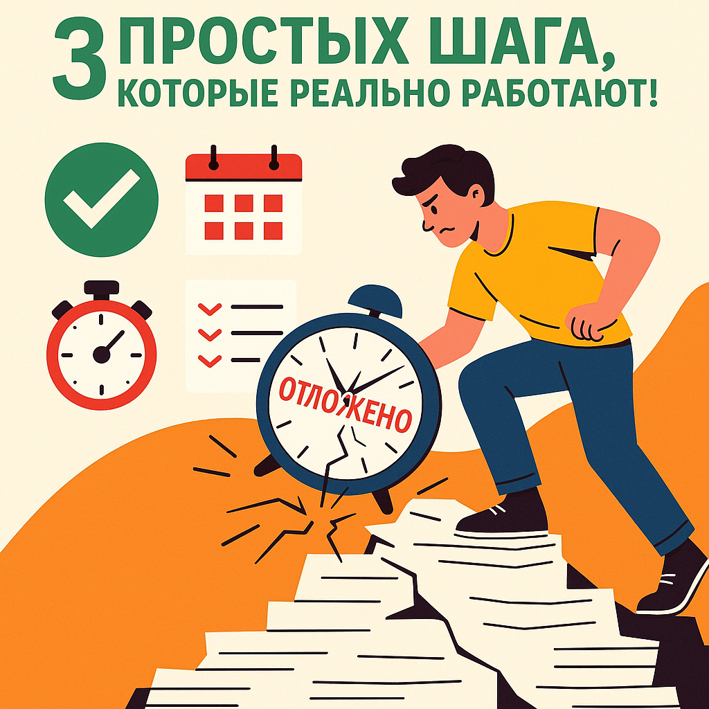 А через час обнаруживаете себя, бесцельно скроллящим ленту. 👉 Важные задачи остаются нетронутыми, а чувство вины растёт. Прокрастинация — это не лень. Это сложная привычка, с которой можно и нужно бороться. Хорошая новость: вам не нужны сложные методики или железная воля. Достаточно 3 простых шагов, чтобы начать действовать прямо сейчас. Шаг 1: Начните с МАЛЕНЬКОГО (Правило 5 минут) Самый страшный враг — это мысль о масштабе задачи. 🧠 «Написать отчёт» звучит огромным и пугающим.