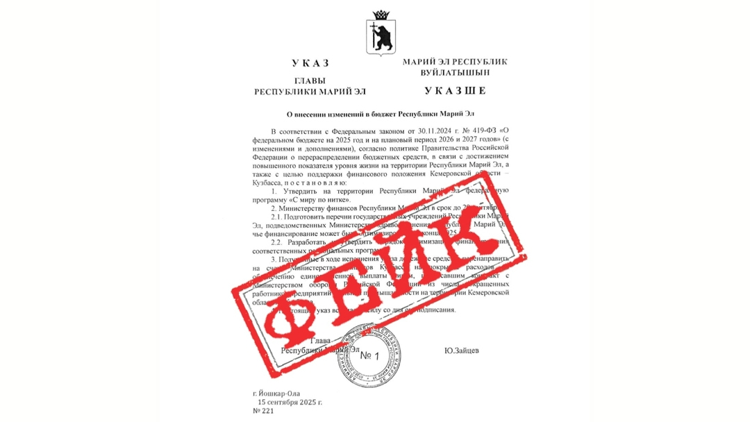 В сети распространяется ложный указ за подписью главы Марий Эл Юрия Зайцева «О внесении изменений в бюджет республики Марий Эл». В документе говорится об утверждении федеральной программы «С миру по нитке», по которой будет оптимизировано финансирование государственных учреждений сферы здравоохранения. Уточняется, что все денежные средства будут направлены на финансовую поддержку Кемеровской области – Кузбасса.