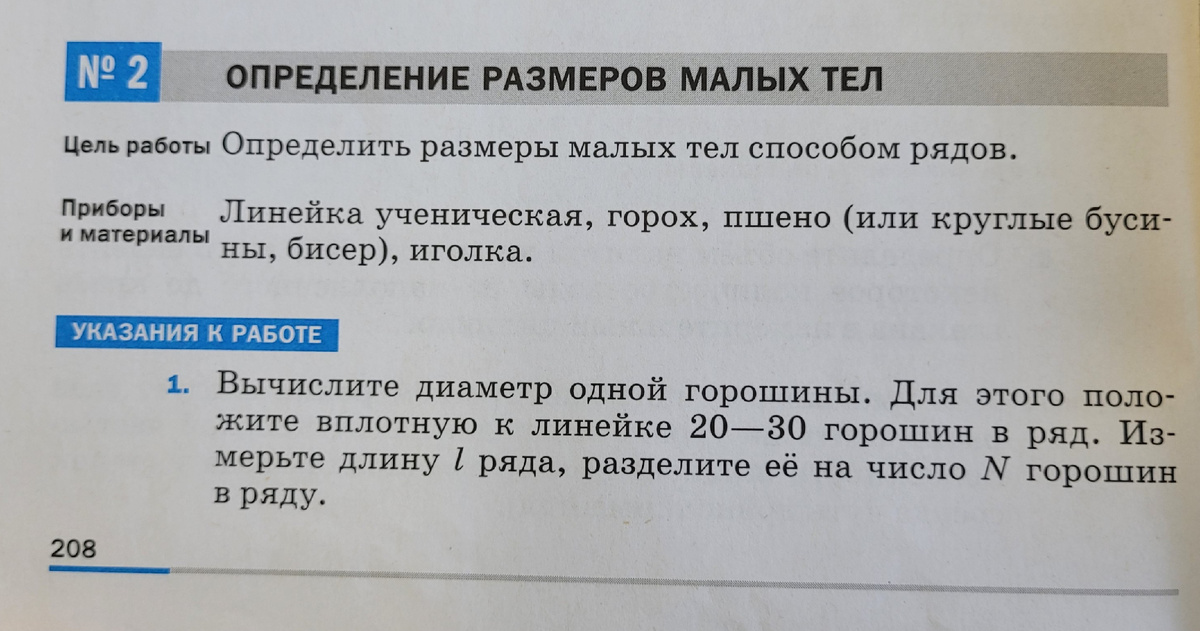 Обратите внимание, что в данной работе мы должны научиться определять размер малых тел (в данный момент гороха и пшена) способом рядов. Т. е. Определим диаметр малого тела.