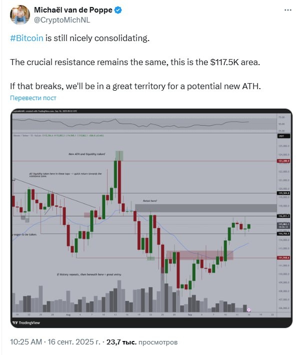 Биткоин всё ещё находится в стадии уверенной консолидации. Ключевое сопротивление остаётся прежним — это уровень в районе $117,5 тыс. Если он будет пробит, мы окажемся в отличной позиции для потенциального обновления исторического максимума (ATH).