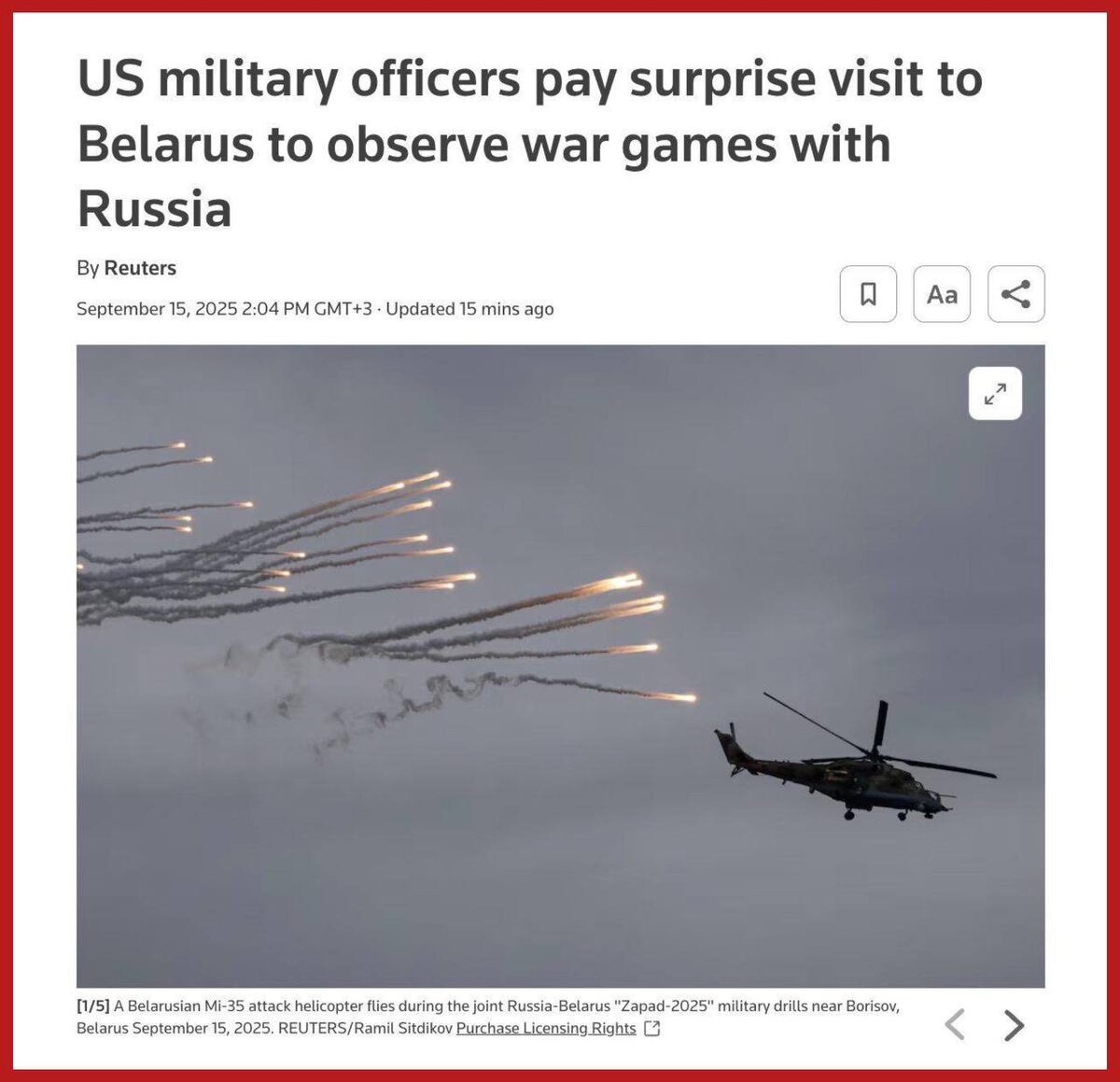 Американские офицеры нанесли неожиданный визит в Беларусь, чтобы понаблюдать за совместными российско-белорусскими военными учениями «Запад-2025», — Reuters. Подпишись на Телеграм Александр Семченко