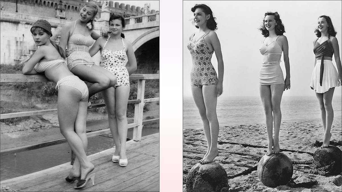 Перед нами редкий летний кадр, где молодые девушки в стильных купальниках конца 50-х позируют на деревянном мостике у воды. Лёгкая улыбка, выразительные силуэты красивой эпохи, популярные тогда горошек и полоска – всё дышит лёгкостью и юношеским озорством. Атмосфера беззаботного отдыха, когда важны лишь солнце, компания и тёплый день.