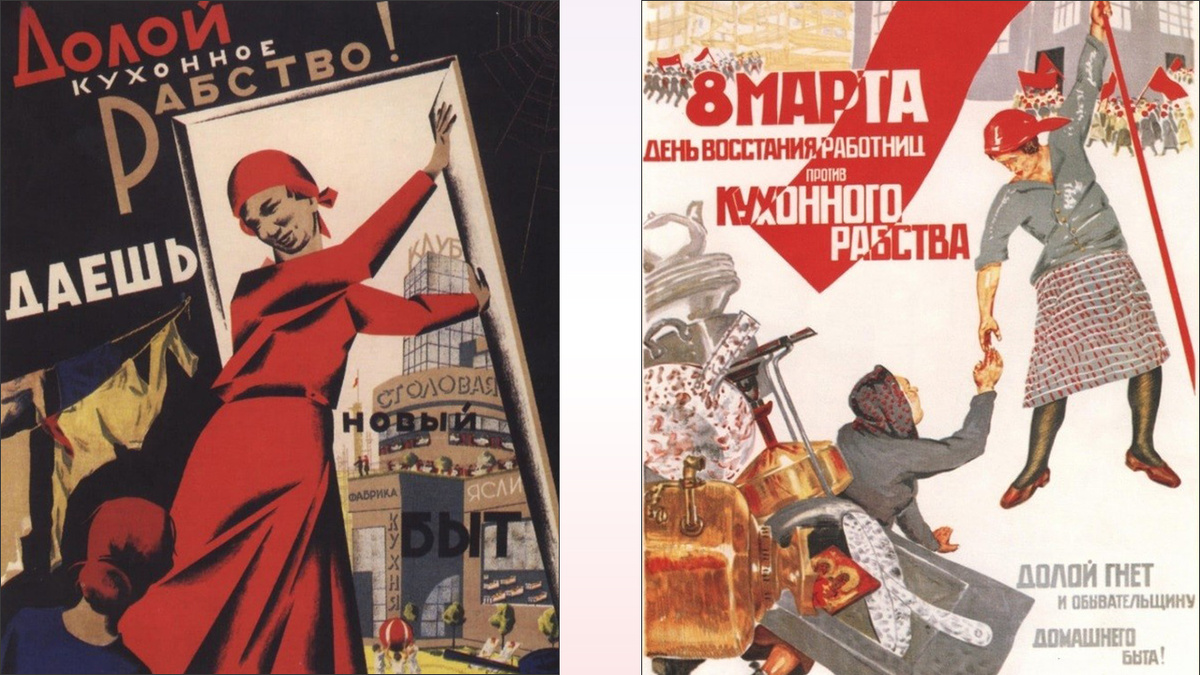 Перед нами яркий советский плакат, призывающий женщин оставить однообразие кухни и стремиться к новому быту. Красное платье героини на фоне окошек и лозунгов говорит о переменах и духе времени. В интерьере плаката узнаются утварь, кастрюля и сушка для белья — бытовые детали ушедшей эпохи, наполненные верой в лучшее и настроем на обновление. Атмосфера решимости, солнца и новых возможностей.