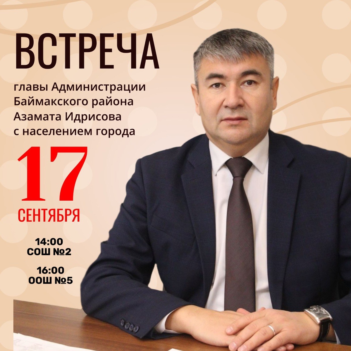 ❗ Уважаемые баймакцы! 📅 Завтра, 17 сентября, глава Баймакского района Азамат Идрисов проведёт очередные встречи с населением города. 👇 Они состоятся: ⌚ СОШ №2 - 14:00; ⌚ ООШ №5 - 16:00. 🗣 Приходите, чтобы обсудить интересующие вас вопросы и найти пути их решения!
