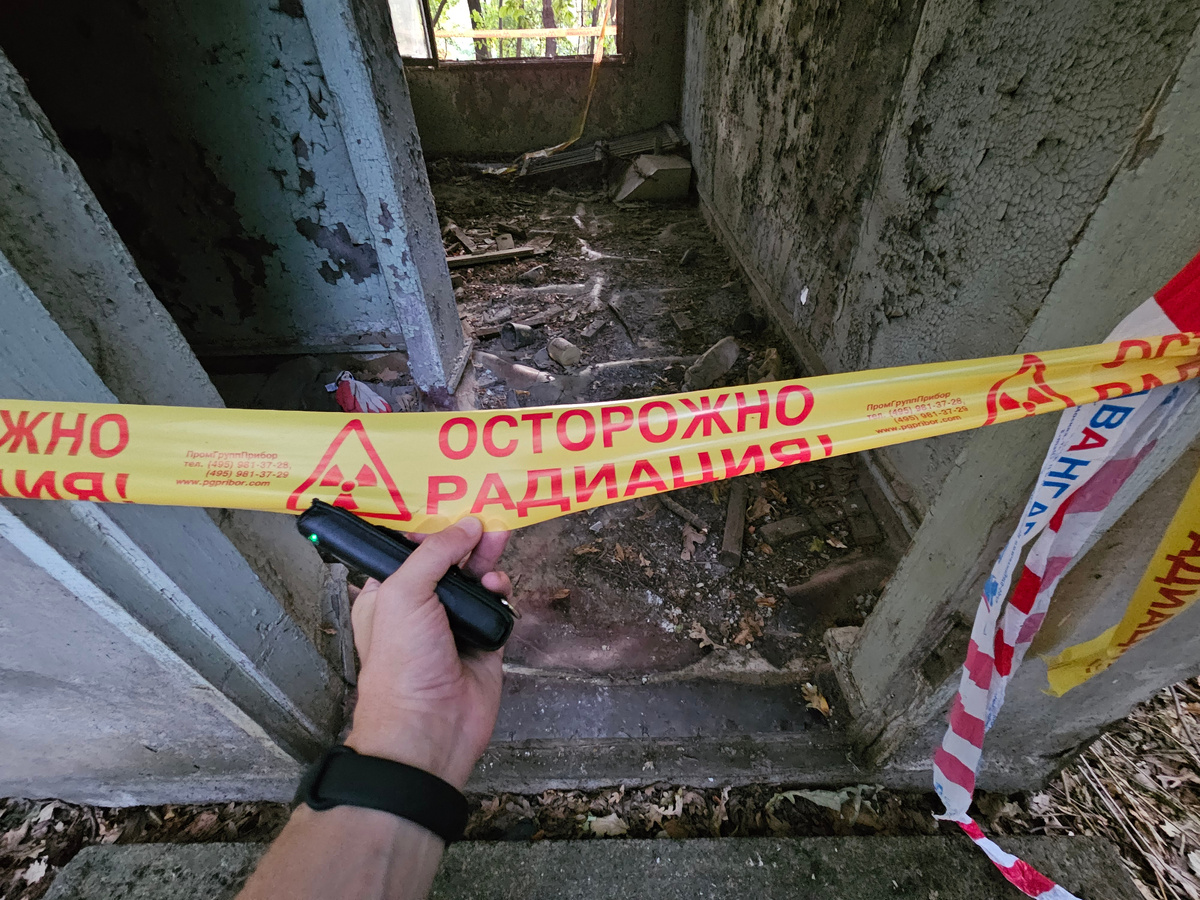 Но самое впечатляющее нас ждало впереди! Рядом с сарайчиком мой товарищ обратил внимание на обширную территорию оцепленную жёлтой информационной лентой, при приближении к которой дозиметр нервно увеличивал свой треск.