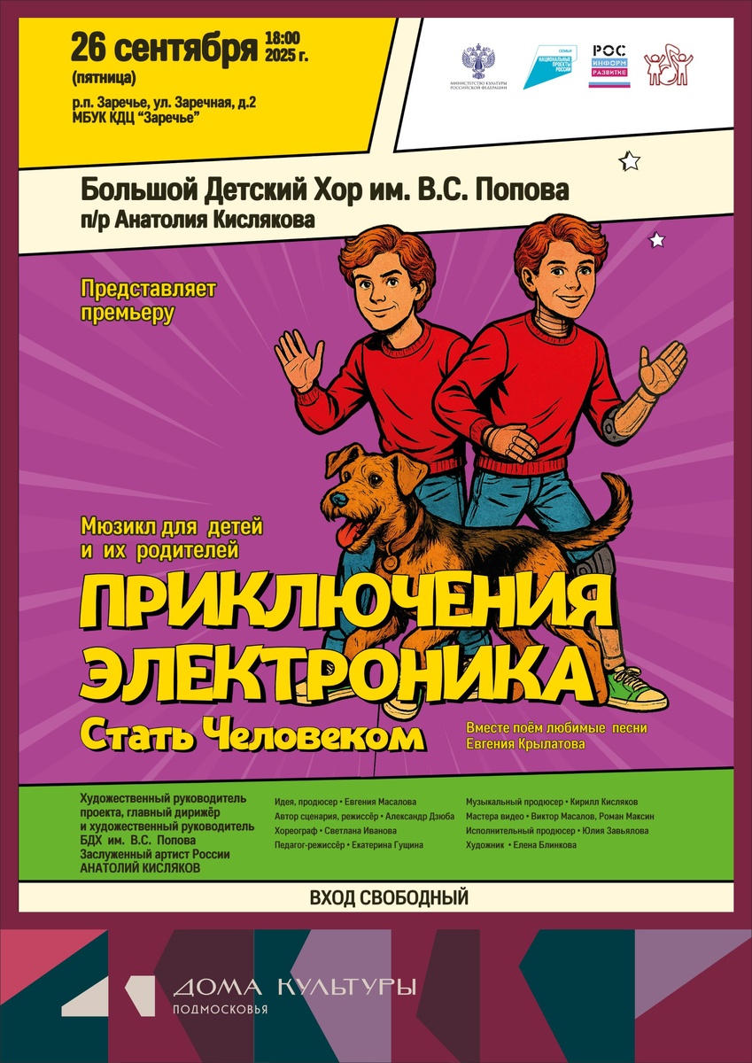 🎶 ПРИГЛАШАЕМ! 🎶 26 сентября (пятница) в 18:00 Мюзикл "ПРИКЛЮЧЕНИЯ ЭЛЕКТРОНИКА. Стать Человеком" 🎤 Большой Детский Хор им. В.С. Попова под руководством Заслуженного артиста России Анатолия Кислякова представляет премьеру мюзикла для детей, которые обязательно станут взрослыми, и для взрослых, которые когда-то были детьми. 👪 В 1980 году вышел фильм «Приключения Электроника», в котором прозвучала песня «Крылатые качели». Именно эта песня Евгения Крылатова стала и остается «визитной карточкой» Большого Детского Хора Центрального телевидения и Всесоюзного радио, ныне носящего имя своего основателя – Виктора Сергеевича Попова. 🎠🎡 Для Большого Детского Хора – опыт создания полноценного мюзикла, с настоящими сложными танцами, с красивейшим художественным оформлением, сложной музыкой и светом – уже далеко не первый. Постановки собирают неизменные аншлаги по всей стране. 💯 ❗ВХОД СВОБОДНЫЙ❗ #кдцзаречье #культура_одинцовскийгородскойокруг #культуравзаречье #культура #ОГО #культураОГО