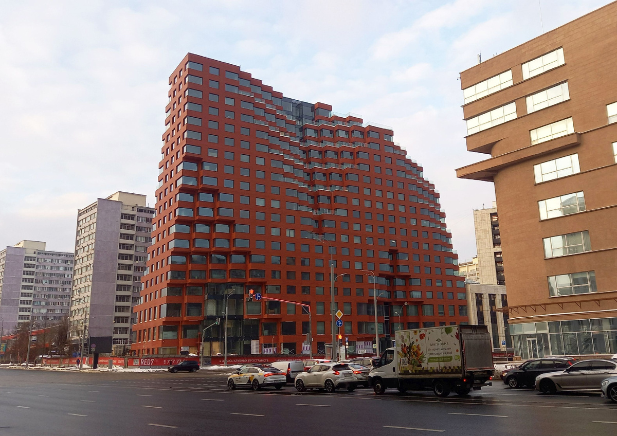 Начнем нашу виртуальную экскурсию по Москве с пересечения Садового кольца и проспекта Академика Сахарова. Здесь несколько лет тому назад появилась крайне необычное, футуристичное здание красного цвета, по форме напоминающее сложенные друг на друга кубы. Это ЖК «RED7», фасад которого состоит из динамичных «пиксельных» объемов. Отнести данное здание, как, впрочем, и почти любой другой образец современное архитектуры, к какому-либо конкретному стилю довольно непросто. Вероятно, здесь мы имеем дело с чем-то на стыке структурализма и хай-тека, а также легкой примесью конструктивизма.