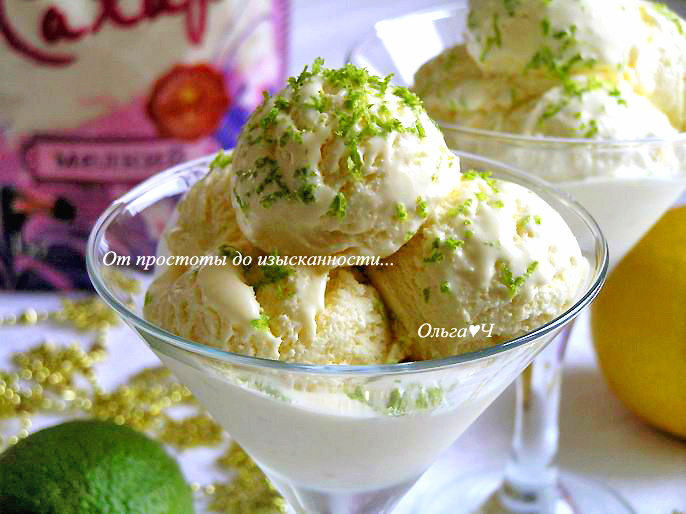 цедра лайма для украшения Приготовление: Желтки взбейте с сахаром и ванилином около 5 минут. Сливки (200 мл) налейте в кастрюльку, добавьте цедру лимона и лаймов, доведите почти до 85*С (или когда от сливок начнет подниматься пар). Тонкой струйкой влейте горячие сливки в желтки с сахаром, постоянно помешивая венчиком. Поставьте смесь на средний огонь и снова доведите до 85*С, постоянно помешивая. Остудите до комнатной температуры. Добавьте взбитые сливки (150 г), перемешайте. Влейте сок лимона и лаймов, перемешайте. Массу перелейте в мороженицу. Кстати, если не любите ощущать цедру в мороженом, то на этом этапе можно процедить смесь, переливая в мороженицу. Готовьте