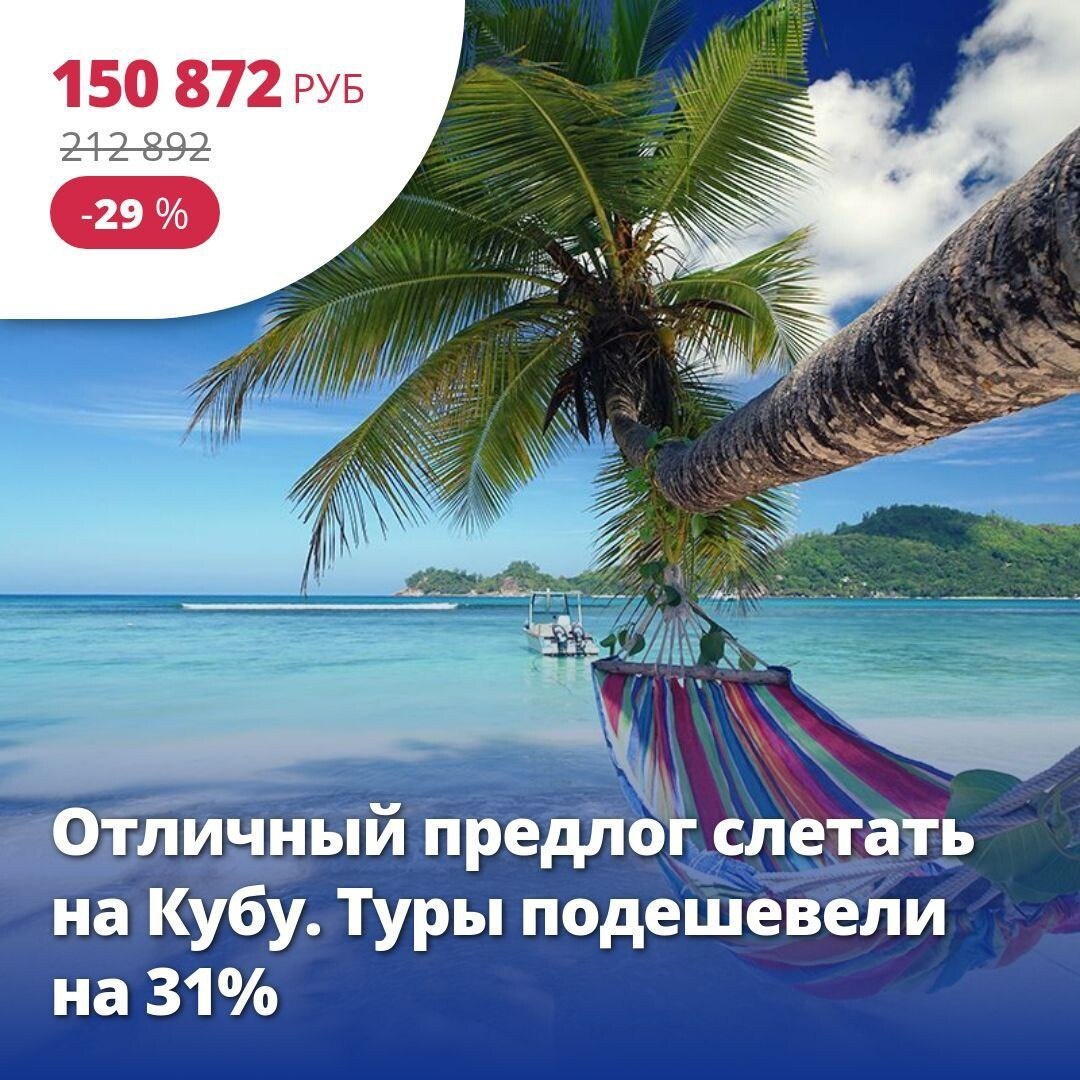 🔥 Цена тура: 150 872 руб/чел ❤️ Отличный предлог слетать на Кубу. Туры подешевели на 31% 🏠 5*, Куба, Варадеро из Москвы 23 сентября на 14 ночей. Лицо кубинского туризма — Варадеро — центр крупной курортной зоны в Карибском регионе, занимает полуостров Икакос. Здесь потрясающая пляжная линия с мягким белым песком, признанная ЮНЕСКО одной из самых чистых во всём мире. Она защищена от стихий океана коралловым рифом. Варадеро, в первую очередь, выбирают ценители качественного пляжного отдыха и поклонники дайвинга Подробнее здесь: https://starttime.ru/search-tours?tvcard=wqis5t Лучшие туры https://starttime.ru/search-tours #СтартТайм #ЛучшийТур