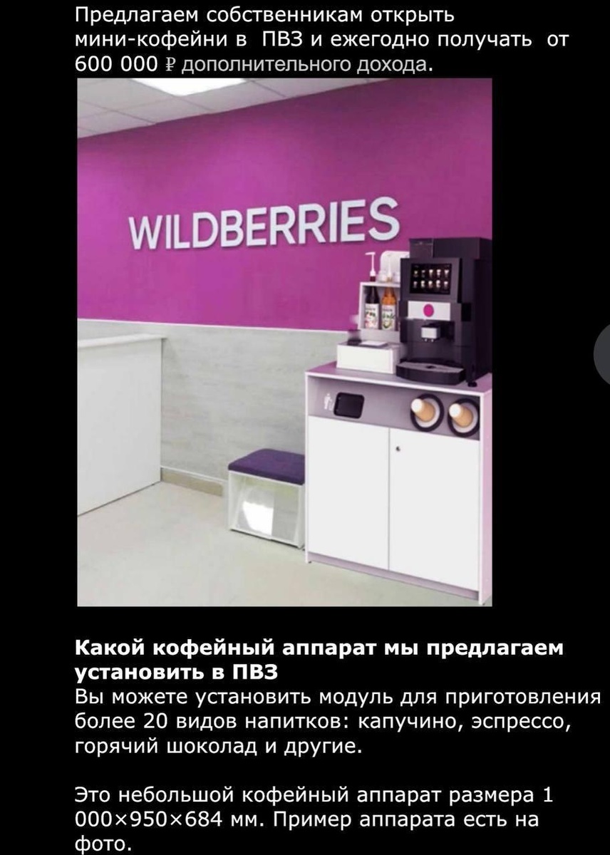 Маркетплейсы обдумывают дополнительные возможности для бизнеса в ПВЗ 🟣 Wildberries предложил устанавливать в ПВЗ кофейные аппараты, которые можно купить или взять в лизинг (самостоятельно на стороне приобрести нельзя), цены на кофе можно будет устанавливать самому. 🔹 Ozon рассматривает для ПВЗ возможность субаренды, выдачи посылок других курьерских служб и скидок. Мы так подумали, в ПВЗ нужен бар — и покупки будет где обмыть, и жену с примерки веселее ждать, и сотрудники стресс снять смогут после работы... Спешл для продавцов — кальян на корвалоле.