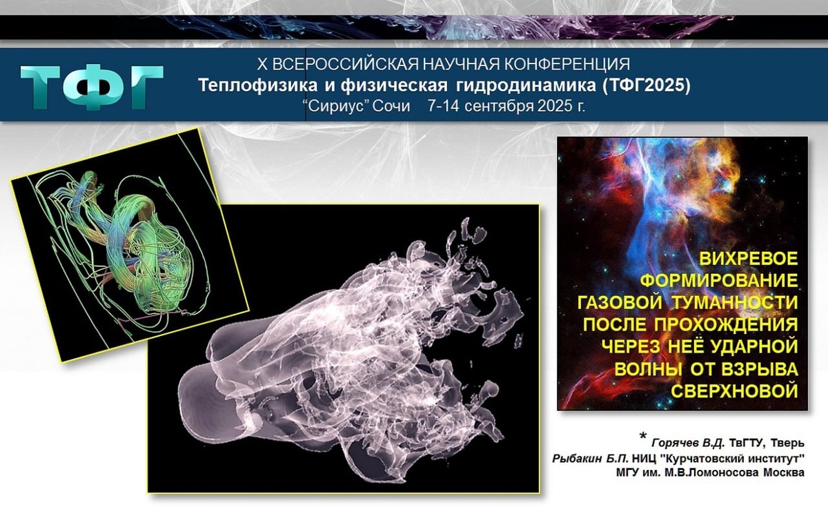 ⭐️ Профессор ТвГТУ представил доклад на Всероссийской конференции «Теплофизика и физическая гидродинамика» Заведующий кафедрой высшей математики ТвГТУ профессор Горячев Валерий Дмитриевич принял участие в X Всероссийской научной конференции «Теплофизика и физическая гидродинамика» (ТФГ2025). Конференция, посвященная фундаментальным проблемам современной теплофизики и гидрогазодинамики, проходила с 7 по 14 сентября 2025 года в Сочи. Валерий Горячев представил в секции «Численные методы, методы искусственного интеллекта в теплофизике и гидрогазодинамике» научный доклад под названием «Вихревое формирование газовой туманности после прохождения через неё ударной волны от взрыва сверхновой». В работе проанализированы результаты математического моделирования вихревого формирования галактических туманностей во Вселенной и изменения в их морфологии при временной эволюции. Выявлена динамика спиральной турбулентности в образовании фрагментов облаков, особого состояния, при котором наблюдается