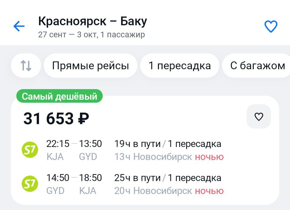 У "Зелёных" относительно приятный Баку на сентябрь-октябрь. Стыковки в Новосибирске совсем не возбуждают, но что поделать. А прямой? А прямой 55к ↔️ https://aviasales.tpm.lv/saNNZZuD #GYD @KJA